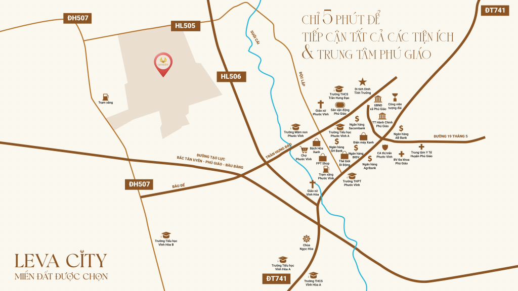 Vị trí khu đô thị Leva City luôn được xem là yếu tố mang tính bứt phá và tạo nên giá trị khác biệt. Tọa lạc tại Xã Vĩnh Hòa, huyện Phú Giáo, tỉnh Bình Dương (nay là xã Phước Hòa, Thành phố Hồ Chí Minh), Khu đô thị Leva City nằm ngay vùng lõi phát triển của Bắc Bình Dương, nơi đang chứng kiến tốc độ đô thị hóa mạnh mẽ và là điểm đến mới của nhiều doanh nghiệp dịch chuyển nhà máy về phía Bắc tỉnh. Nhờ vị trí nằm giữa hai trục giao thông quan trọng ĐH505 và ĐH507, dự án dễ dàng tiếp cận tuyến ĐT741 – con đường huyết mạch kết nối Bình Dương – Bình Phước – Đồng Nai – TP.HCM.